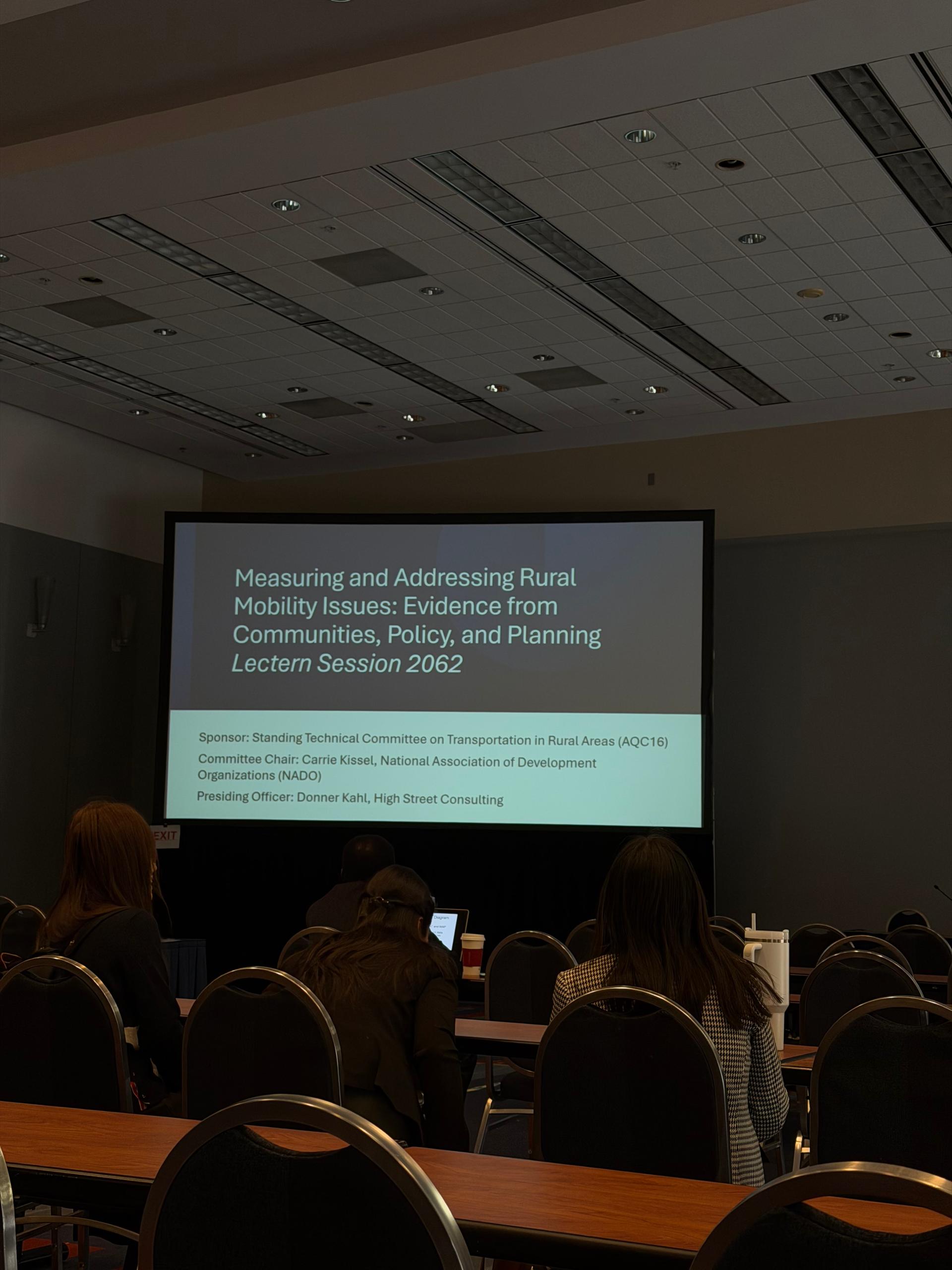 Our research titled “The Rural Mobility Index: A Composite Framework for Capturing Multidimensional Mobility Constraints in Rural Areas” was successfully presented at the 2026 Transportation Research Board (TRB) Annual Meeting as part of Lectern Session #2062: Measuring and Addressing Rural Mobility Challenges: Evidence from Communities, Policy, and Planning.